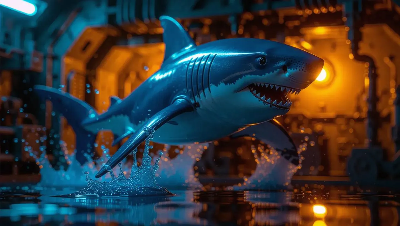 A 1:6 scale superhero shark figure in a dynamic underwater pose, wearing a sleek blue nano-suit with glowing gills and an undersea mining tool. Premium box inserts feature water splash effects and comic-style bubbles. Set against a high-energy toy prototyping chamber, illuminated with vibrant blue and yellow lights, hyper-realistic with a touch of comic book flair.