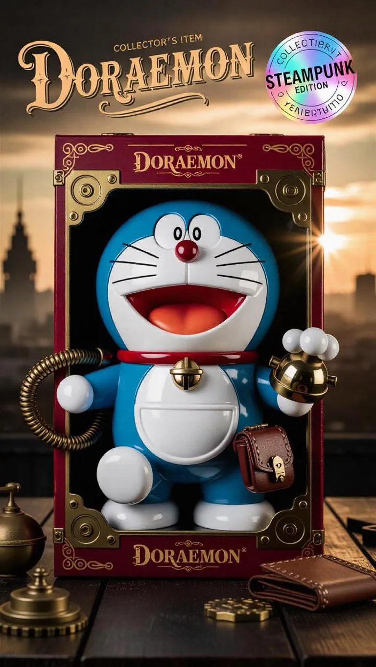 A steampunk-inspired collectible action figure of Doraemon, packaged in a classic-style toy box. Doraemon features a chrome and brass redesign with detailed engravings, glowing topaz eyes, and leather straps. His round body is detailed with steam vents and gear systems, and his bell and pouch are upgraded with Renaissance motifs. The packaging showcases serif fonts, muted action poses, and a holographic 'Collector's Item Steampunk Edition' sticker. Included accessories: steam-driven gadget arm, mechanical notebook. Background: retro-futuristic Hiroshima skyline at dawn, high detail, golden lighting, bright tones.