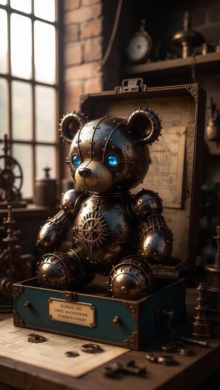 A steampunk teddy bear toy made from rusty steel, canvas patches, and crystal eyes, featuring a winding key on its back. It stands in a collector’s box with rough textures, a faux-border label, and a bronze window frame. The scene is set inside a vintage toy workshop, surrounded by blueprints and mechanics. Soft, twilight light filters through the windows, casting deep shadows and emphasizing the intricate details of the bear and the workshop. The style is realistic, focusing on the tactile and mechanical elements.