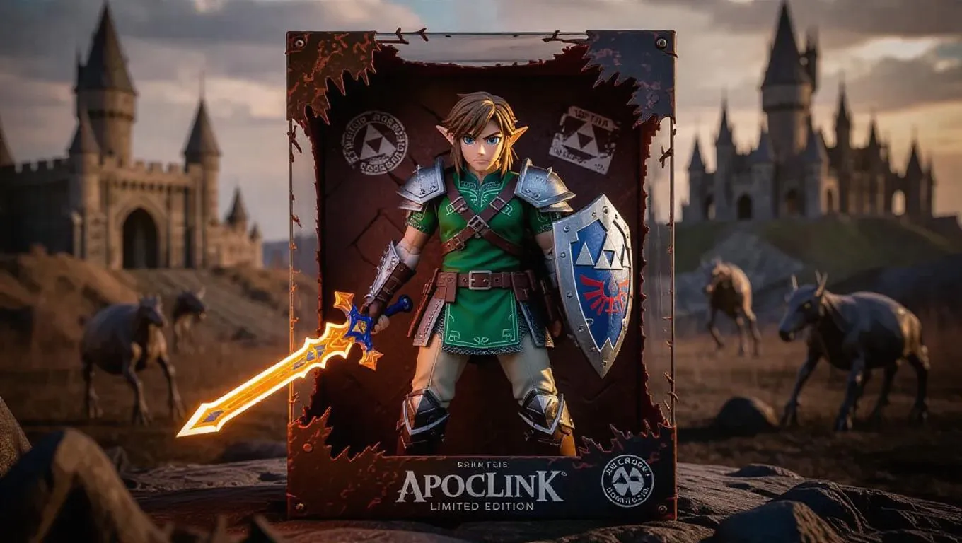An anime-style collectible action figure of Link, reimagined as a post-apocalyptic warrior with rugged armor plates, glowing orange sword, and scrap metal shield. Displayed inside a transparent premium toy box with rusty linings, Triforce stickers, and 'ApocLink Limited Edition' branding. Background: ruined Hyrule Castle with burnt ruins, mutated creatures, and desolate wasteland. Style: post-apocalyptic.