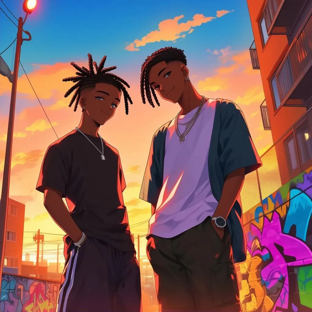 Generate vibrant AI anime art of two Black friends with short braids and trendy haircuts bonding on a summer evening. Craft dynamic urban scenes, playful camaraderie, and anime-style visuals with vivago.ai's AI image tools for striking character designs and atmospheric effects.