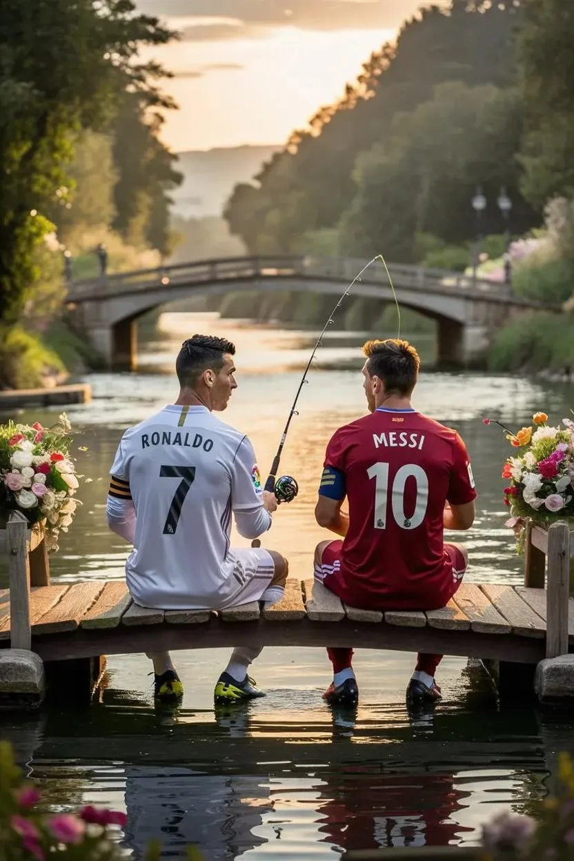 Craft an AI-generated image of Ronaldo in a number 7 jersey and Messi in red number 10 fishing by a riverside bridge. Perfect for football fans, this creative scene blends sports icons with serene nature. Optimize visuals with vivago.ai's AI effects for lifelike textures, dynamic lighting, and seamless composition. Ideal for social media, memes, or digital art projects.