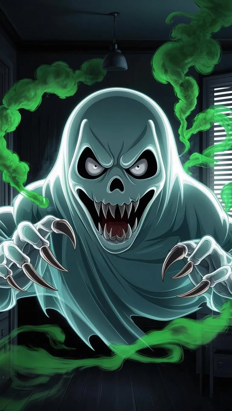 Generate eerie AI visuals of a menacing transparent ghost with sharp claws, glowing teeth, and green smoke aura. Inspired by Naoki Urasawa's style, craft cinematic horror scenes for animated shorts like "Ghosts" using VivaGo's AI tools for professional-grade spectral effects and haunting atmospheres.