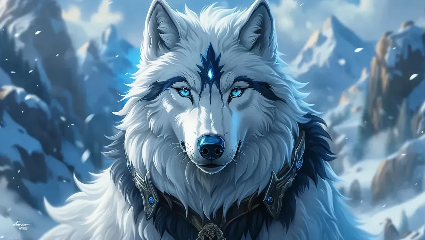 Generate stunning anime-style AI art of a majestic white wolf with piercing blue eyes and a distinctive black neck crest. Create vivid, detailed animal characters effortlessly using Vivago.ai's text-to-image tools for professional anime illustrations and unique creature designs.