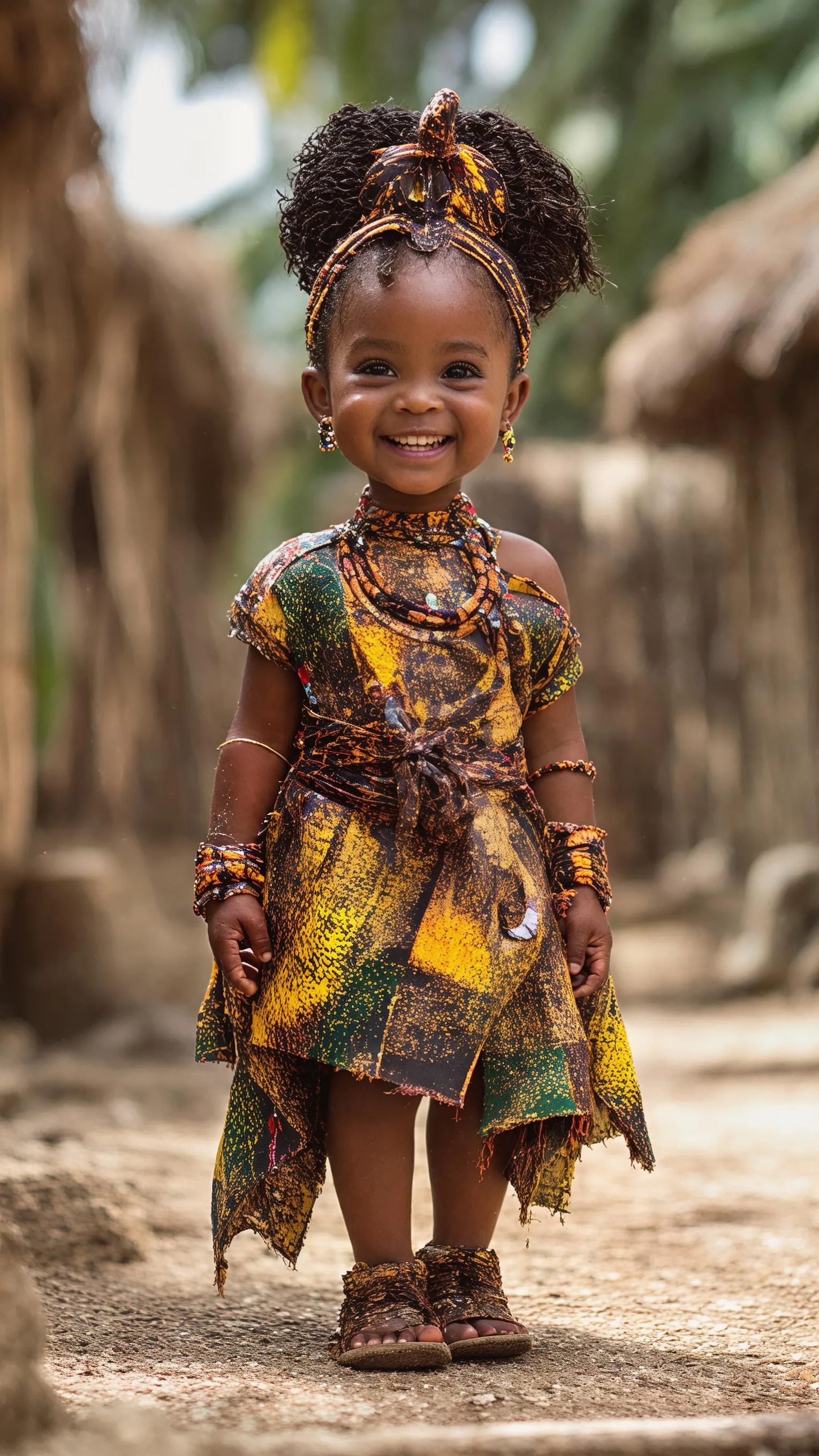 Generate an AI-generated portrait of a cute, smiling African kid in traditional Nigerian Igbo attire. Full body view. Features culturally styled hair, a beautiful village background setting. Create authentic, vibrant AI images with Vivago.ai.