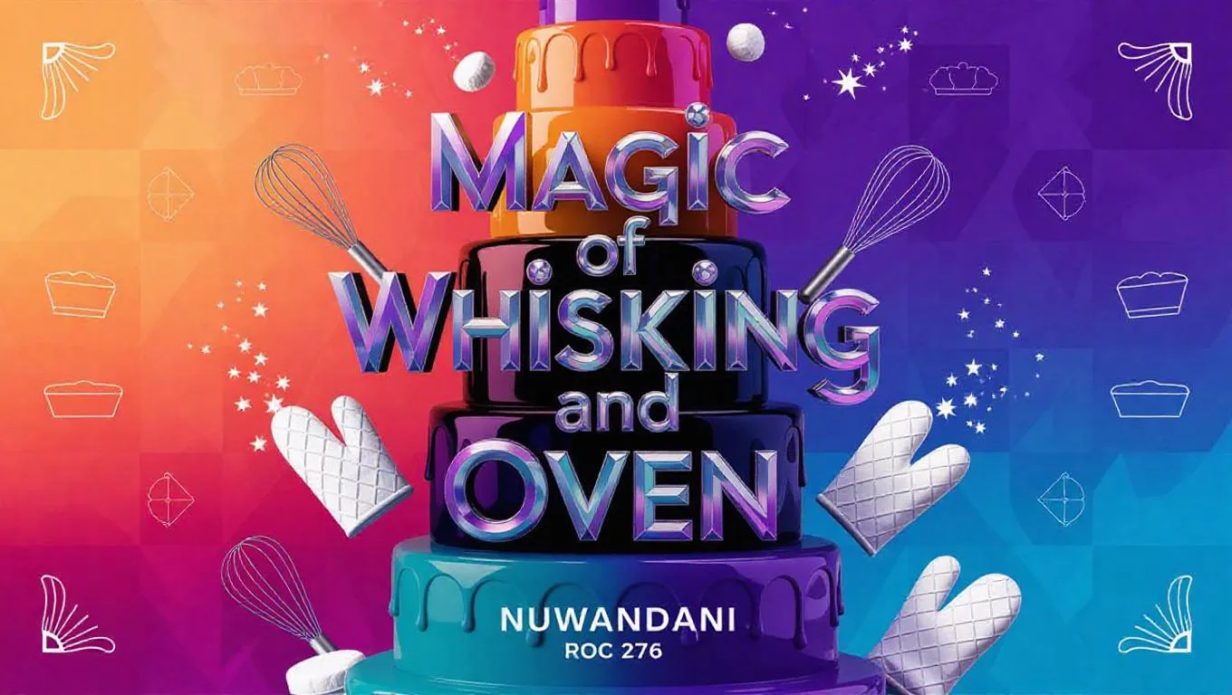Create a vibrant AI-generated A4 cover design with a towering 3D "Magic of Whisking and Oven" title in prismatic metallic lettering. Features cascading jewel-toned cakes, levitating whisks with stardust, and steam-swirled oven mitts against sunset gradients. Dynamic perspective and volumetric lighting enhance marbled fondant textures, crystalline sugar decor, and floating flour particles for professional baking-themed visuals.
