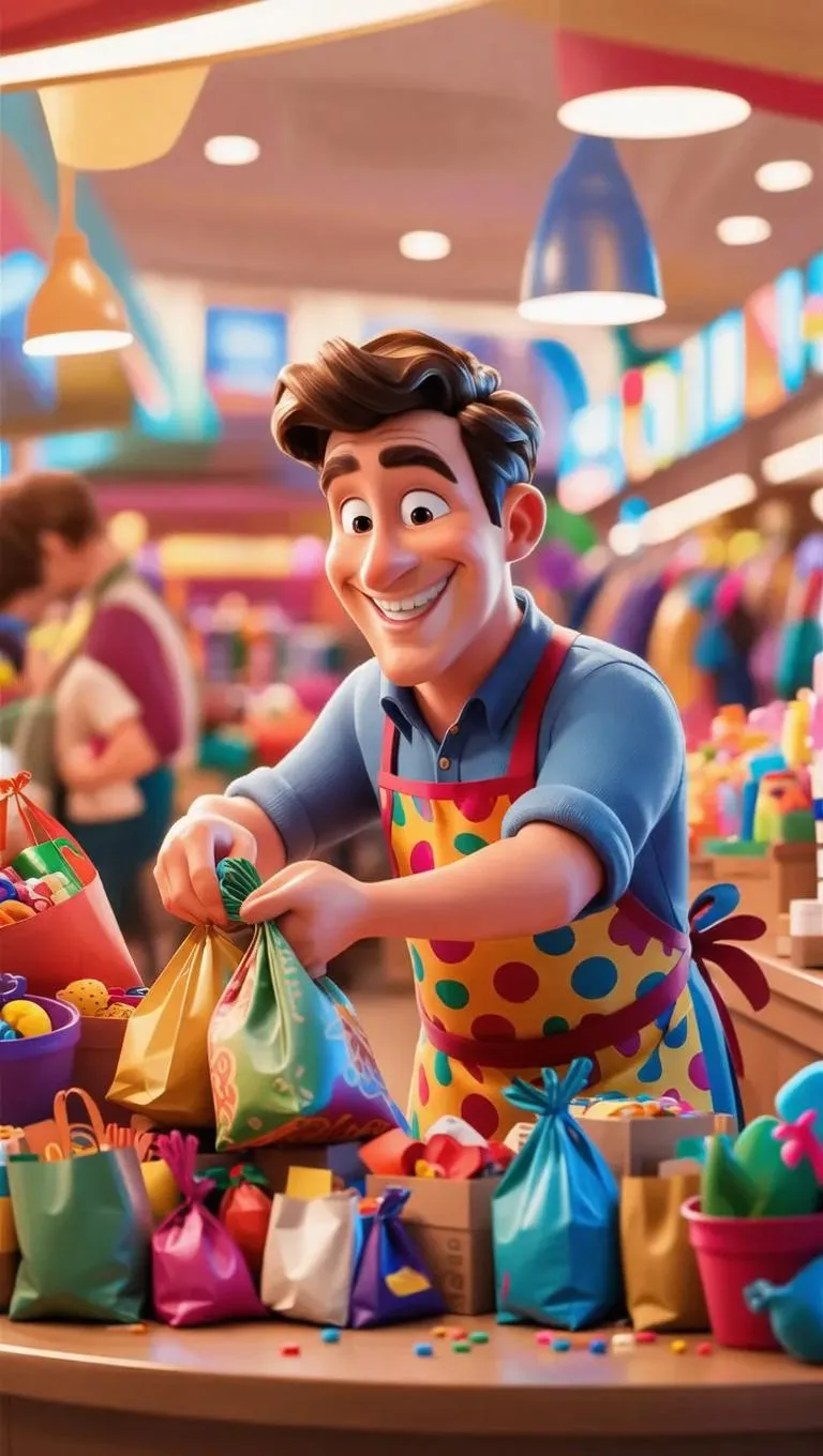 Generate a vibrant Pixar-style 3D AI image of a cheerful shopping mall owner packing colorful goods in a bright, lively scene. Highlight his playful apron, friendly smile, and meticulous hands organizing vibrant products. Warm lighting enhances the joyful atmosphere, with a blurred background focusing on his dedicated, busy demeanor.