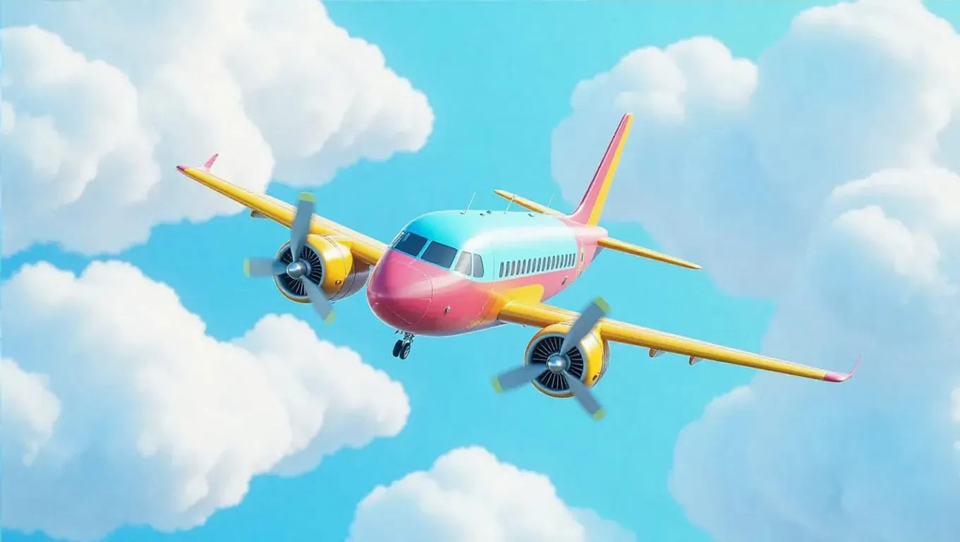 Generate a vibrant 3D toy airplane with dual engines and pastel hues soaring through a bright blue sky with fluffy clouds. This realistic medium long shot uses rule of thirds composition and glowing light effects to create a playful, fun scene. Perfect for creative projects with VivaGo AI's advanced image generation tools.