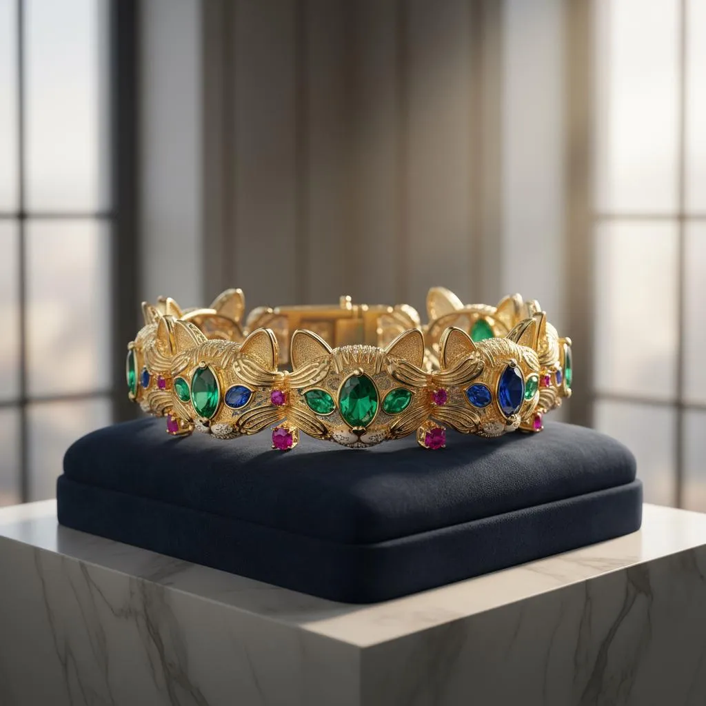 Design an AI-generated luxury bracelet inspired by your reference image using Vivago.ai. This exquisite gold piece features meticulous emerald, ruby, and sapphire detailing for flawless elegance. Perfect for modern jewelry campaigns, we transform concepts into premium gemstone-adorned masterpieces through prompt-based AI creation.