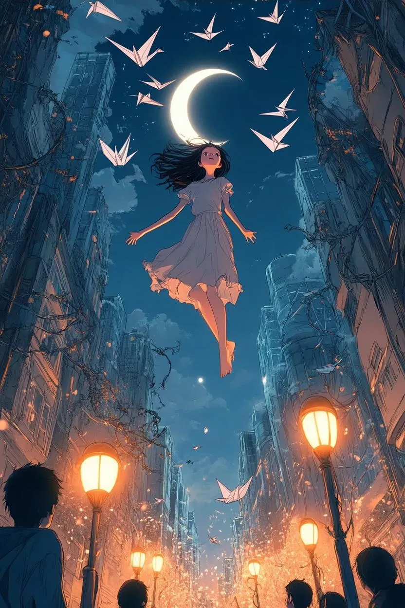Create stunning AI-generated anime art of a girl ascending into a surreal sky above a collapsing glass city. Glowing atmospheric details, windswept motion, origami cranes, and a crescent moon reflection. Transform your vision into professional-grade visuals with Vivago.ai's AI image generator and artistic effects tools.