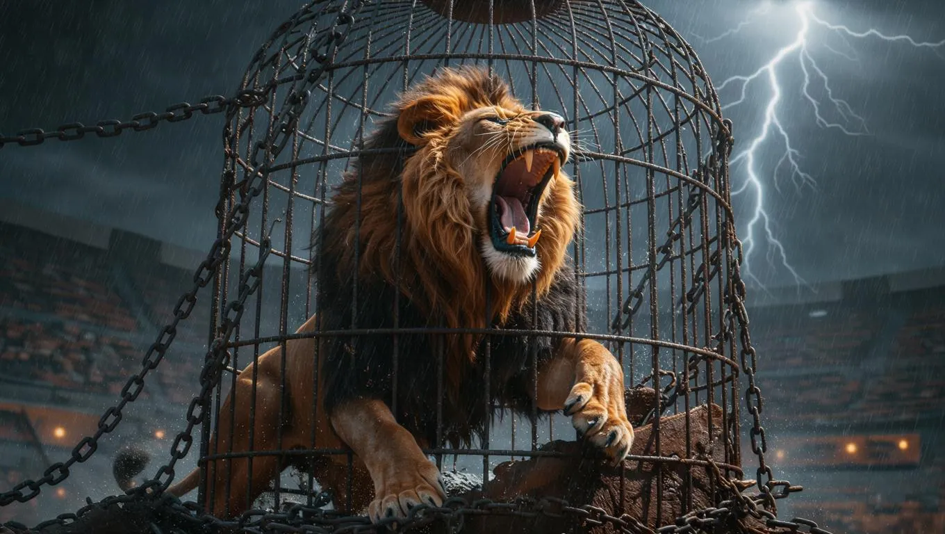 In the arena, a lion roars furiously inside a cage, its powerful movements causing the chains to snap and the cage to collapse. Light rain falls, creating a misty atmosphere, while lightning illuminates the sky in the background. The scene is tense and dramatic, with harsh shadows cast by the intermittent flashes of light, emphasizing the lion's wild and untamed nature. Style: Realistic.