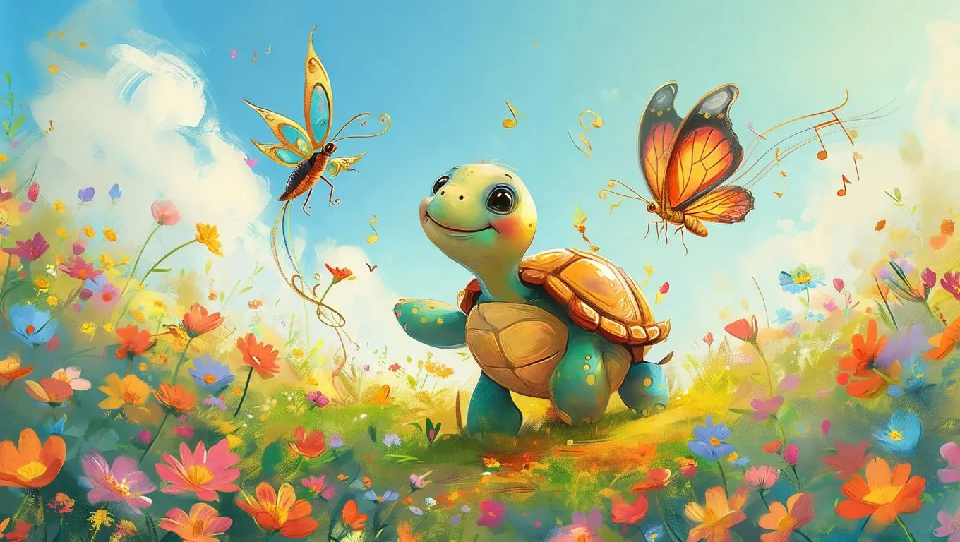 Create enchanting AI-generated art with Vivago.ai! Transform prompts into vivid illustrations of a cute turtle exploring as a colorful butterfly dances to music. Blend hand-drawn, Disney-style, flat design, and handwriting elements for whimsical, vibrant visuals. Perfect for storytelling and digital projects!