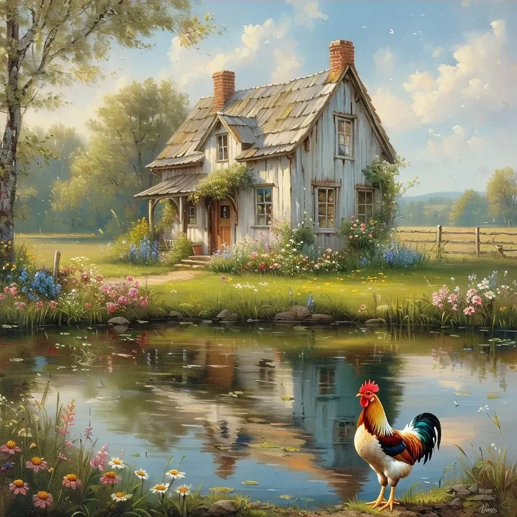 Create a vibrant AI-generated painting of a serene countryside scene: charming house, grazing chicken, sparkling lake, and white picket fence surrounded by blooming flowers. Transform text into vivid, detailed visuals with Vivago.ai's creative tools for professional-grade art and idyllic landscapes.