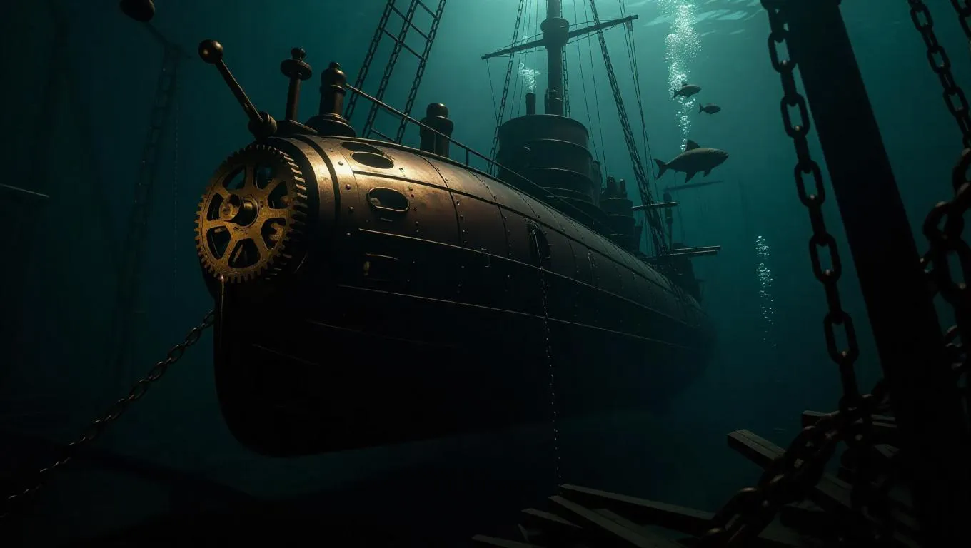 Dutch angle shot of a Victorian submarine exploring ghostly ship graveyards, brass gears rotating amid wrecked masts, air bubbles rising from copper chains, oil-painting style with dark hues, haunting underwater lighting, unique mechanical motifs, shadowy fish creatures.