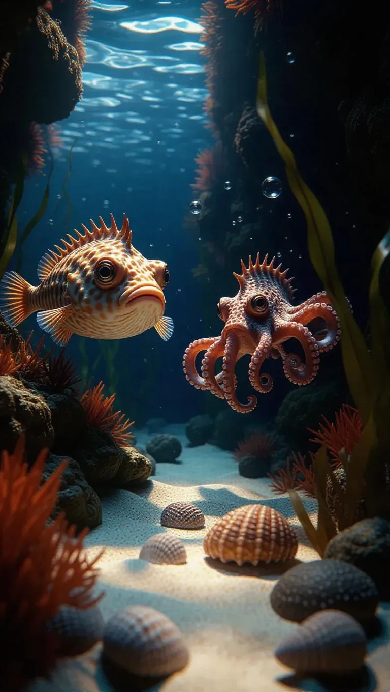 A mysterious underwater detective scene, a fierce pufferfish investigates a missing pearl case, interrogating a crafty octopus and a anxious crab. Clues like cracked shells and a ripped map are scattered among vibrant coral and flowing seaweed, creating a suspenseful and intriguing atmosphere.