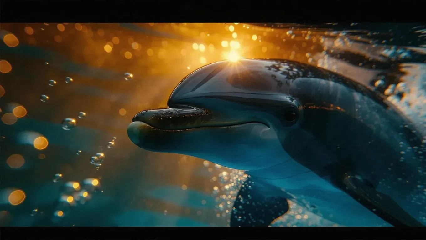 Cinematic close-up of a dolphin's snout nudging a bright obsidian, dramatic shadows cast by ethereal gold light, bubbles swirling around, vibrant underwater gardens adding depth and texture.