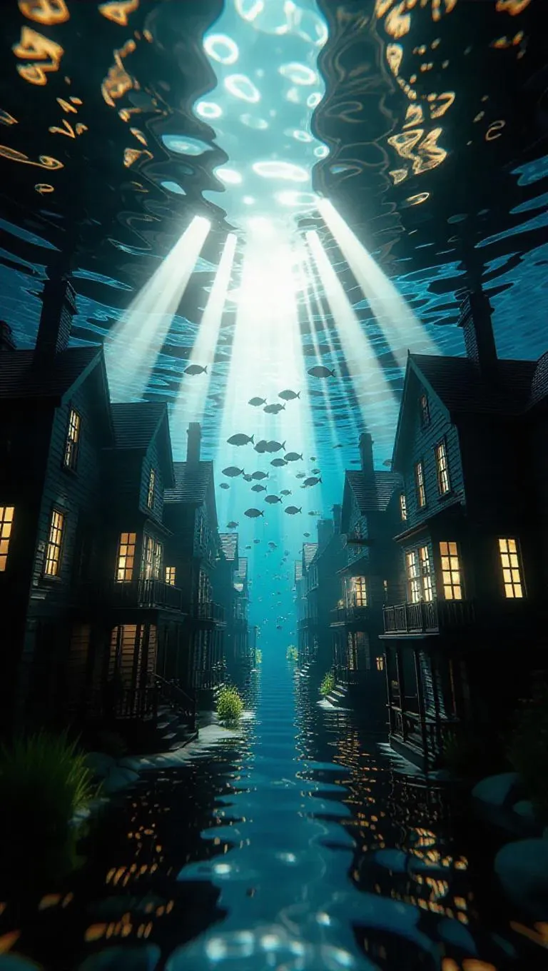 A suburban scene underwater, submerged houses and quiet streets, rays of sunlight piercing through the water, creating a serene play of light and shadow, cinematic lighting, highly detailed, surrounded by swirling schools of peaceful fish, ethereal atmosphere, vibrant colors.