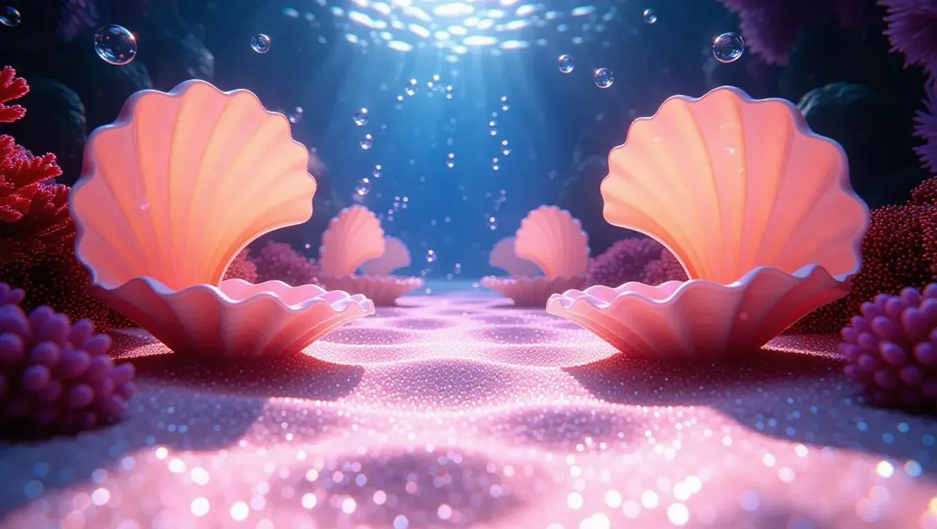 Surreal underwater garden party, giant floating seashells and sparkling confetti, dreamlike colors, weightless atmosphere, ethereal bubbles, soft glowing lights, vibrant coral backdrop, serene and whimsical, surrounded by gentle sea currents, lively puffers lounging nearby.