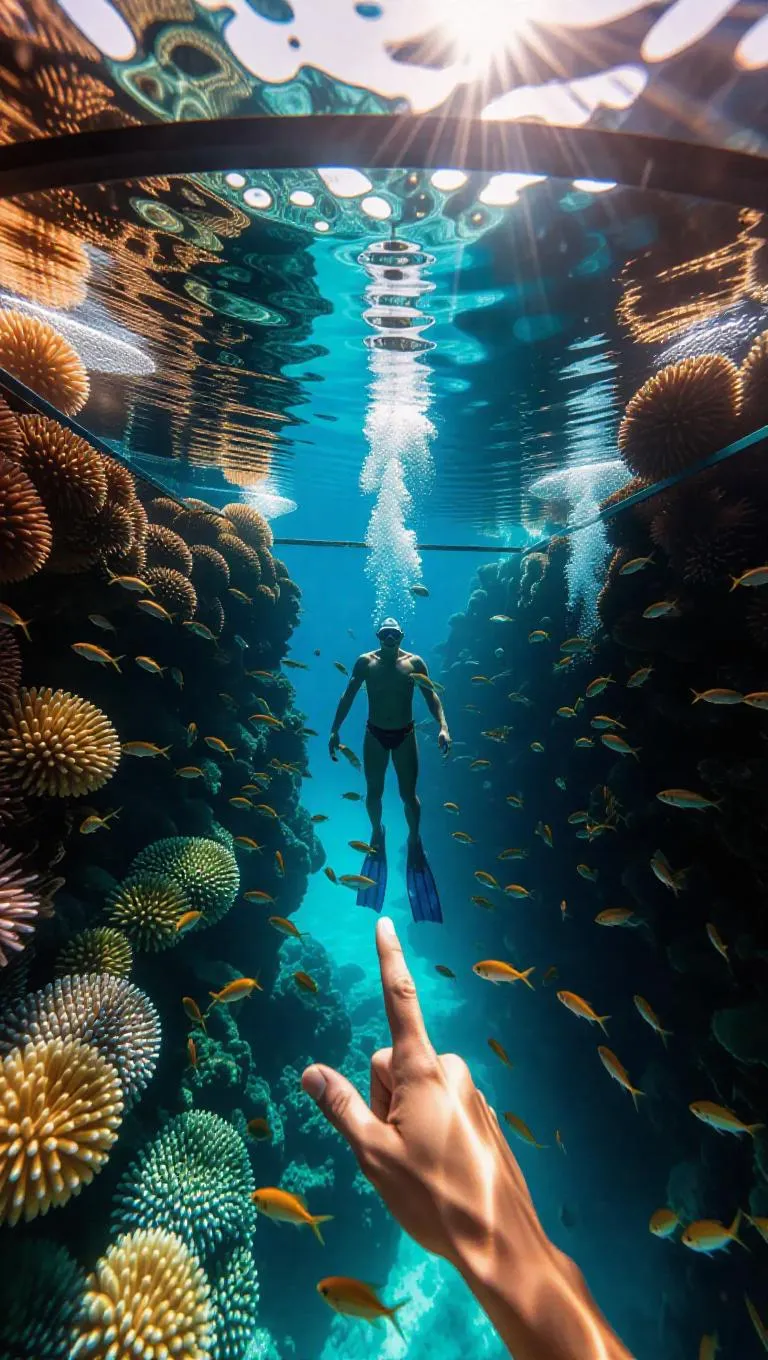 Text to ImageTop-down view of swimmer pointing at jellyfish near stunning coral gardens, schools of mackerel weaving intricate trails, bright sunlight illuminating a glass observation platform, offering a dreamlike underwater vista.Recreate