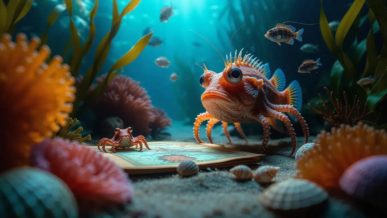 A mysterious underwater detective scene, a clever anglerfish investigates a missing pearl case, interrogating a deceitful octopus and a startled crab. Clues like chipped shells and an old map are scattered among vibrant coral and lush seaweed, creating a suspenseful and intriguing atmosphere.