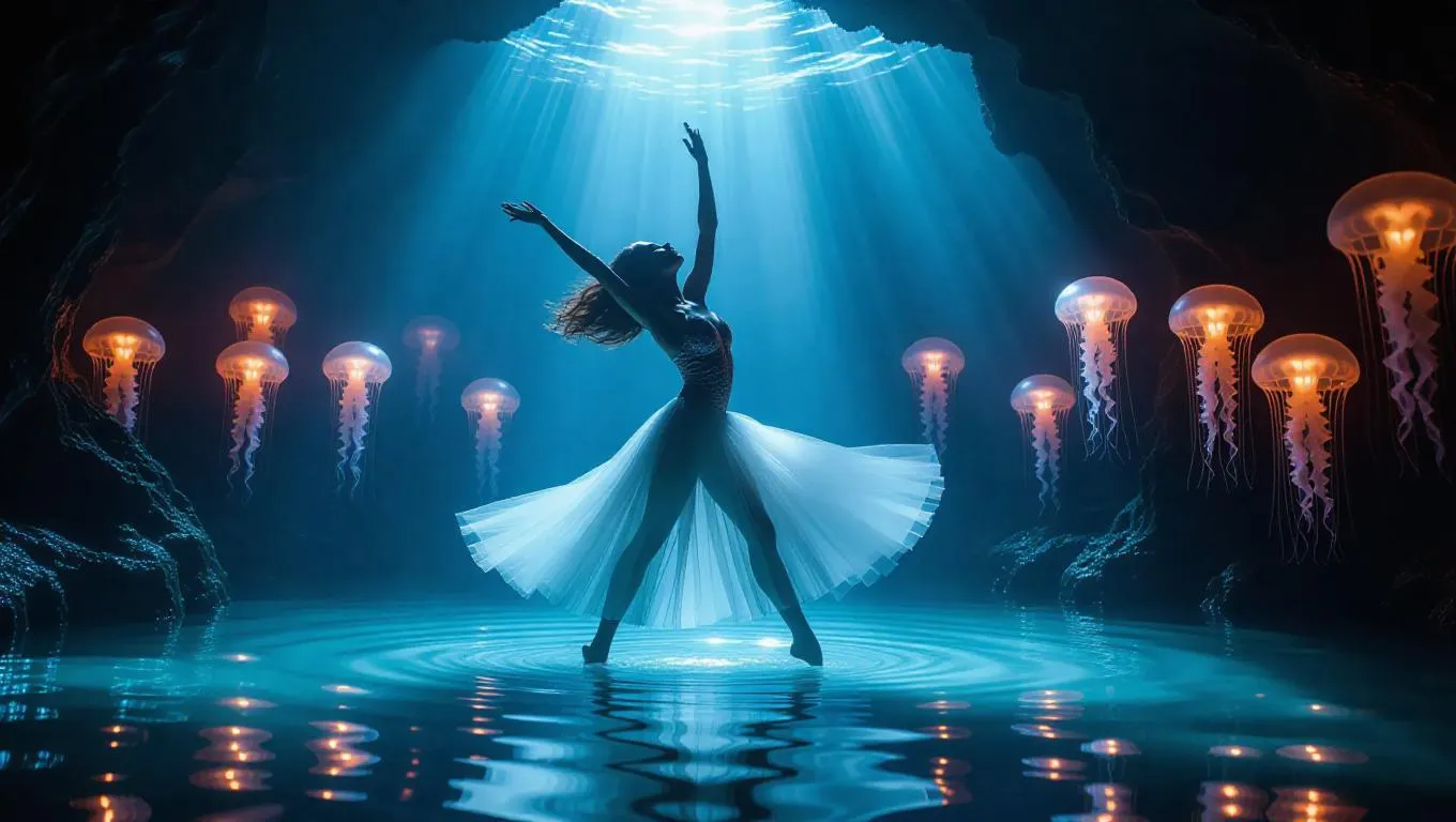 An underwater dancer performs a mesmerizing routine in a shimmering cave, their elegant movements synchronized with the gentle tides. Jellyfish emit soft, bioluminescent glows in the background, enhancing the enchanting and magical atmosphere.