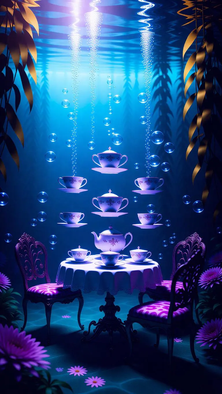 Text to ImageSurreal underwater tea party, floating teacups and chairs, vibrant colors, weightless atmosphere, ethereal bubbles, soft glowing lights, lush kelp forest backdrop, serene and whimsical.Recreate