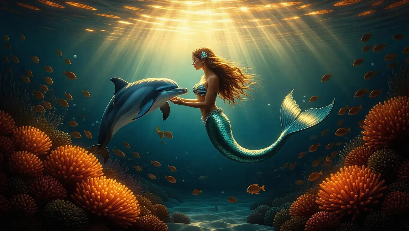 Digital oil painting of a mermaid playing with a dolphin near a bed of glowing corals, ethereal light cascading from above, soft and dreamy, surrounded by shimmering bioluminescent fish, with a mystical aura enhancing the serene underwater atmosphere.