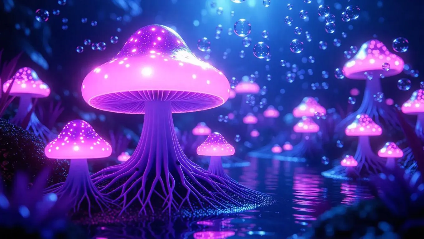 A whimsical underwater mushroom garden with glittering caps, roots sprawling outwards, softly glowing shrimp darting about, bioluminescent bubbles rising from the floor, creating a fantasy, playful atmosphere.