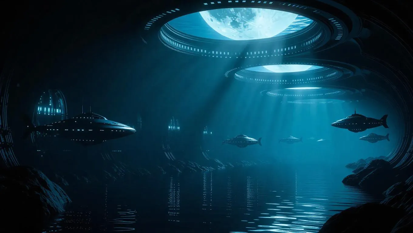 A futuristic scene underwater, depicting a vast oceanic city with organic architecture and advanced technology, rays of moonlight piercing through the water, creating a mesmerizing play of light and shadow, ethereal lighting, highly detailed, surrounded by futuristic submarines.