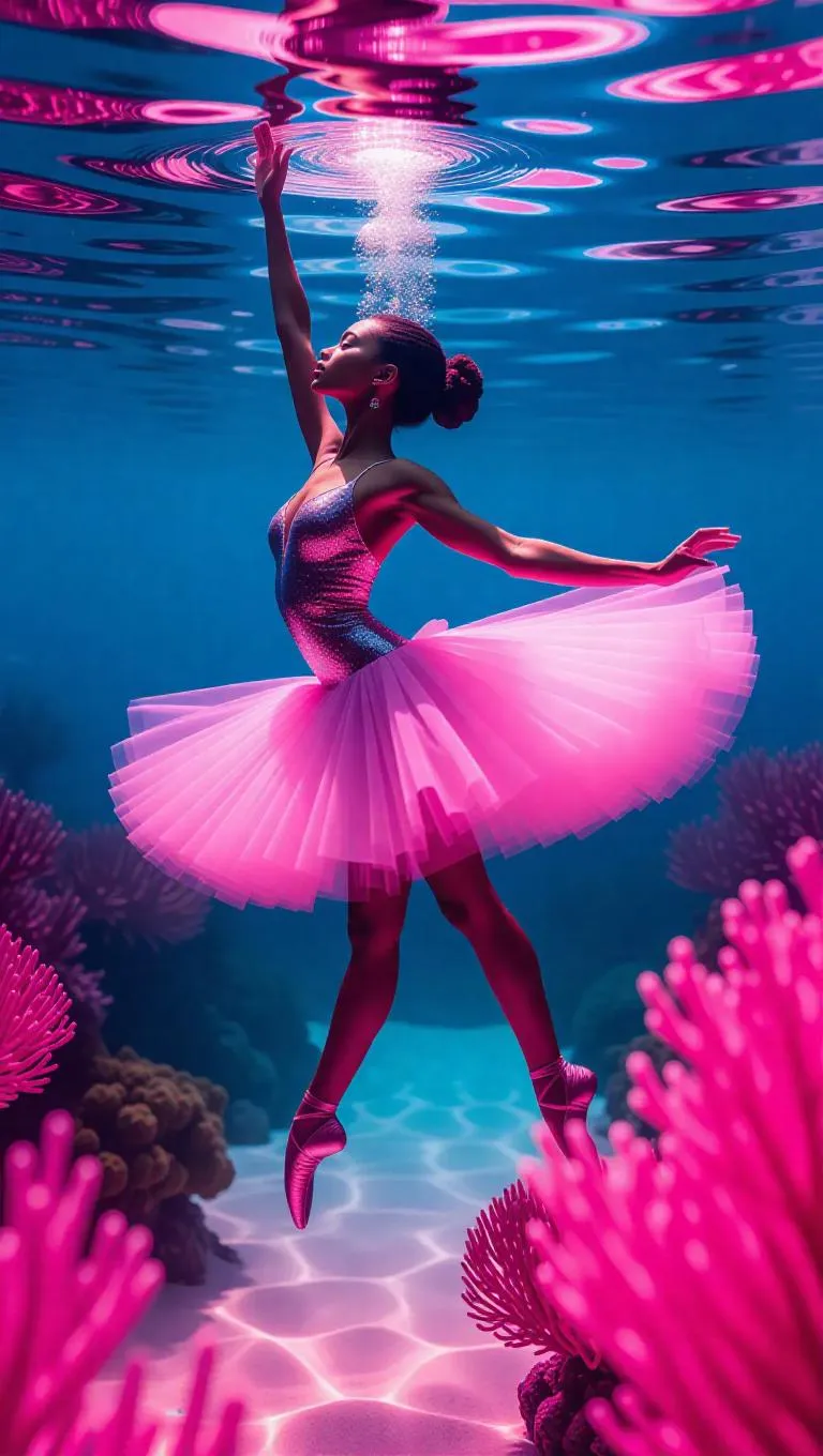 Surreal underwater ballet dancer, composed of shimmering water and radiant light, gracefully gliding through a surreal, pink sea, surrounded by luminous corals, creating a mesmerizing dance of colors and motion.