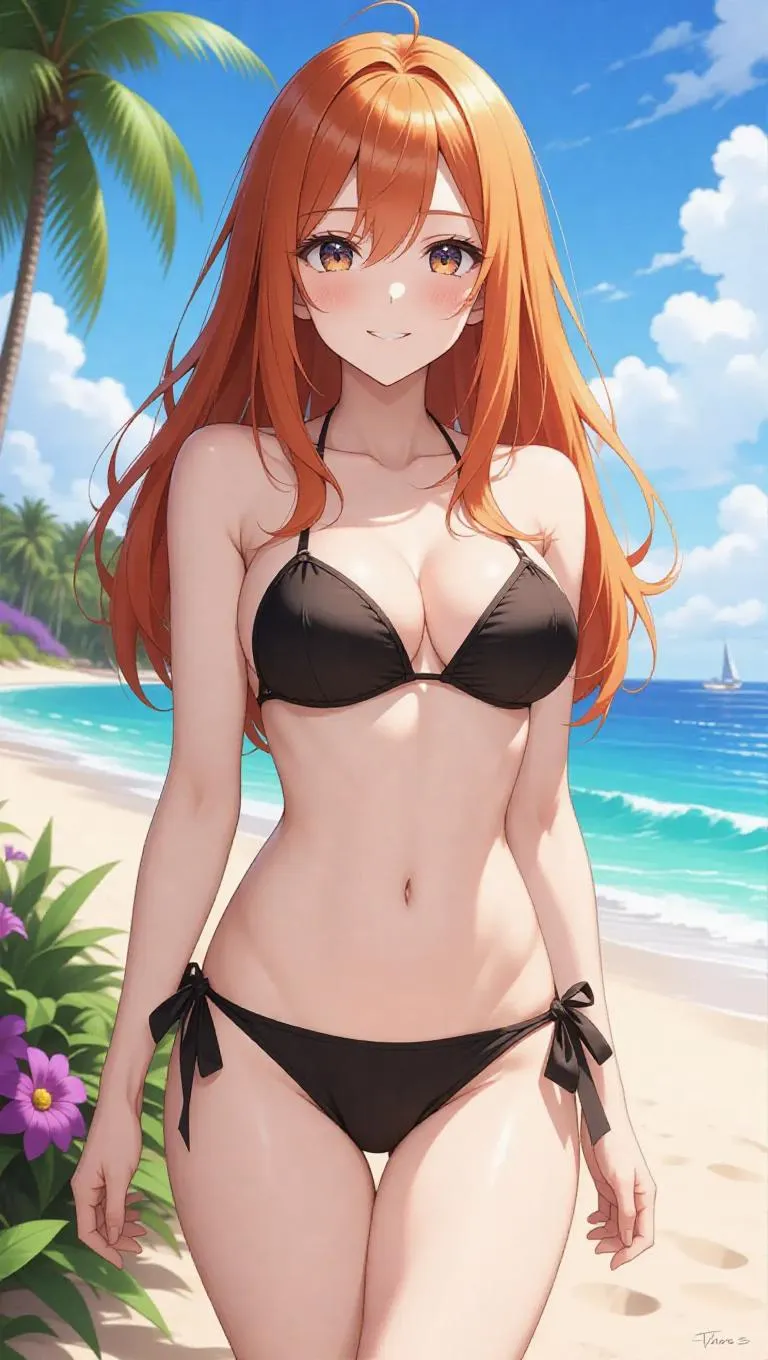 Create stunning AI-generated anime art of a 25-year-old woman with vibrant orange hair, brown eyes, and a slender waist. Featuring a black strapless bikini, radiant smile, and lifelike anime-style details. Perfect for swimsuit-themed digital art, character design, or AI-enhanced creative projects. Professional-grade visuals powered by VivaGo.ai's image generation tools.