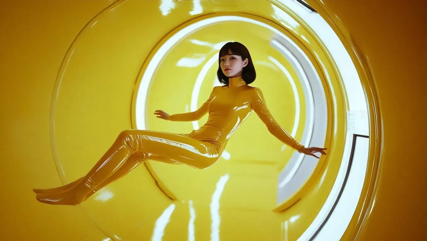 Explore AI-generated photorealistic visuals of a futuristic 1960s retro space station with glossy banana-yellow interiors. A Japanese woman floats elegantly in zero gravity, wearing a sleek yellow jumpsuit. This high-detail scene merges vintage sci-fi charm with modern sophistication, crafted using advanced AI tools for immersive, professional-grade creative projects.