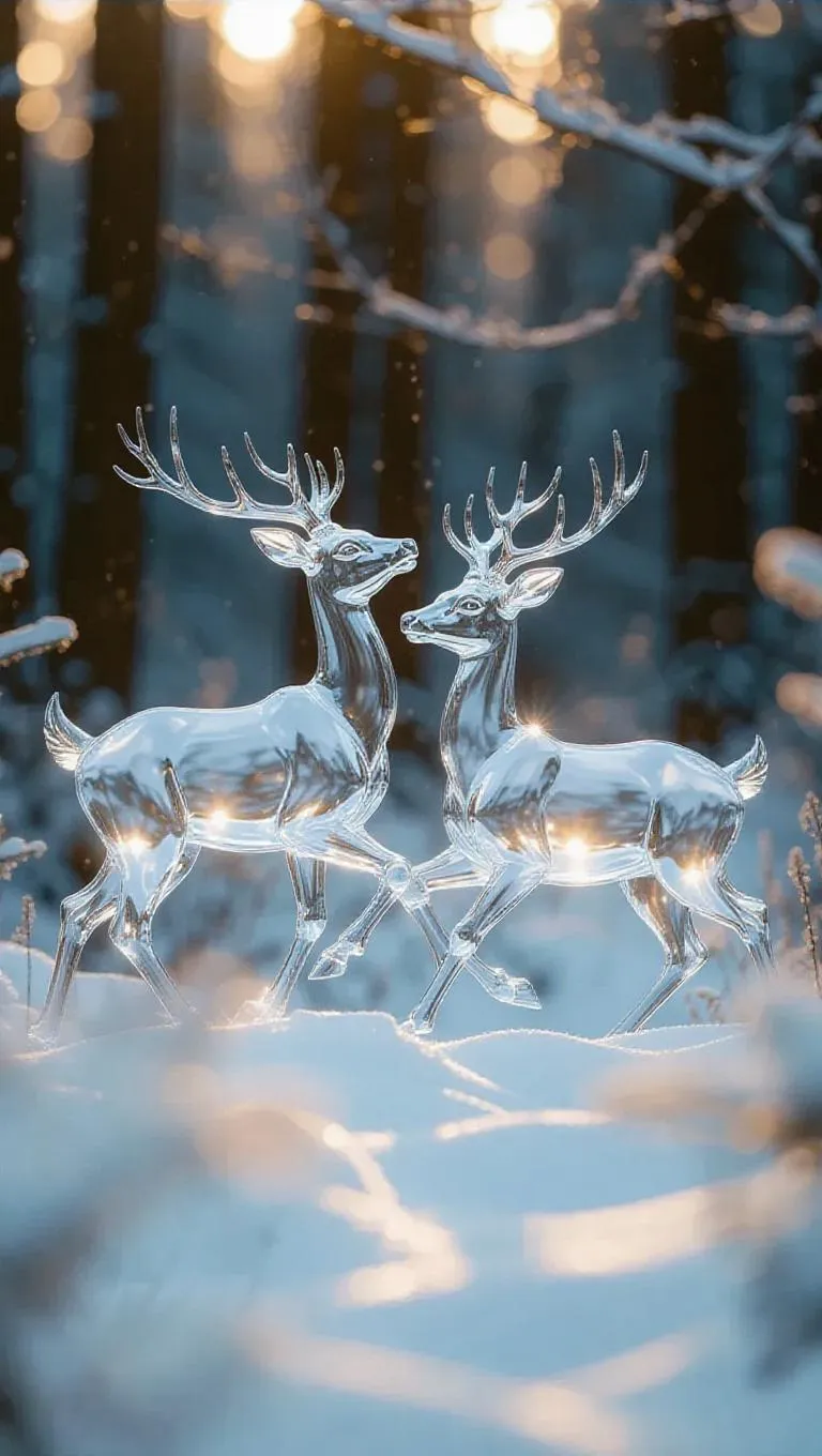 A pair of ethereal crystal deer gracefully dancing through a serene snowy glade, their translucent bodies shimmering as they catch the soft rays of the morning sun, creating a magical and frosty ambiance
