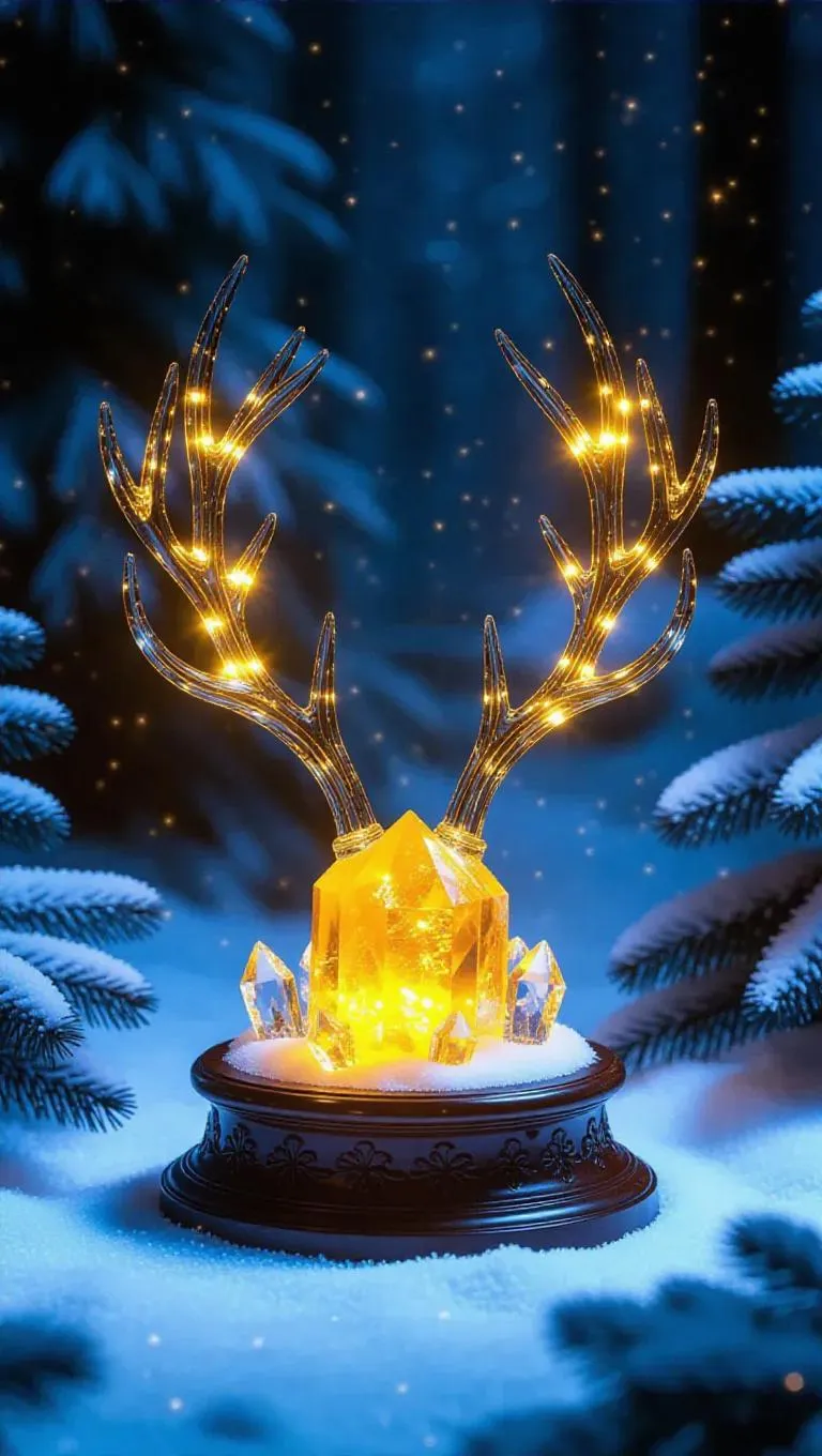 A pair of intricate crystal antlers, perched on an elegant hardwood podium in a mystical ice realm, glowing with a radiant yellow light, surrounded by enchanting fairies and shimmering snowflakes, creating a whimsical and joyous atmosphere, set in a fantastical environment with luminescent trees and sparkling ice crystals.