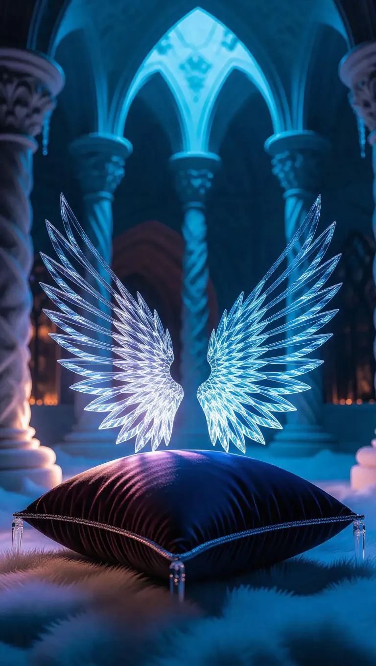 A pair of lavish ice crystal wings, subtly resting on a plush velvet pillow in a historic icy dome, glimmering with an enchanting cobalt light, encircled by sculpted ice columns and luminous icicles, establishing a surreal and fascinating ambiance.