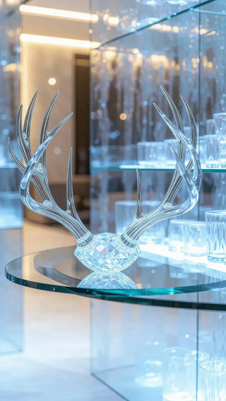 A pair of intricate crystal antlers, resting on a sleek glass shelf in a modern winter-themed lounge, glowing with a futuristic blue light, surrounded by metallic furnishings and frosted glass decor, creating a chic and contemporary atmosphere, set in a stylish, high-tech space with minimalistic design and icy embellishments.