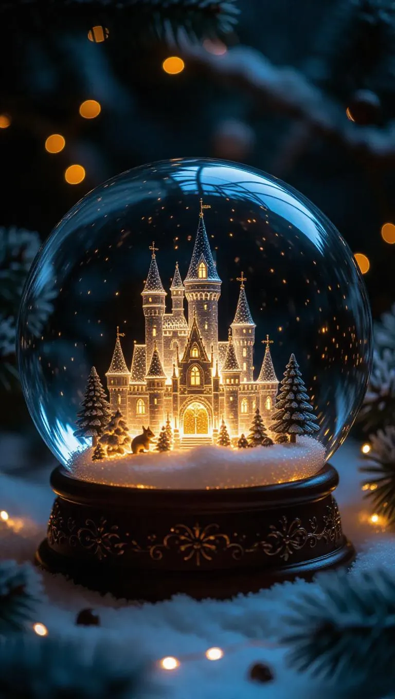 a small, glowing snow globe, illuminated by soft, golden light. Inside, a miniature ice castle dazzles with intricate details, surrounded by a flurry of cascading snowflakes, with a tiny squirrel collecting acorns, creating a magical and enchanting snowy forest.