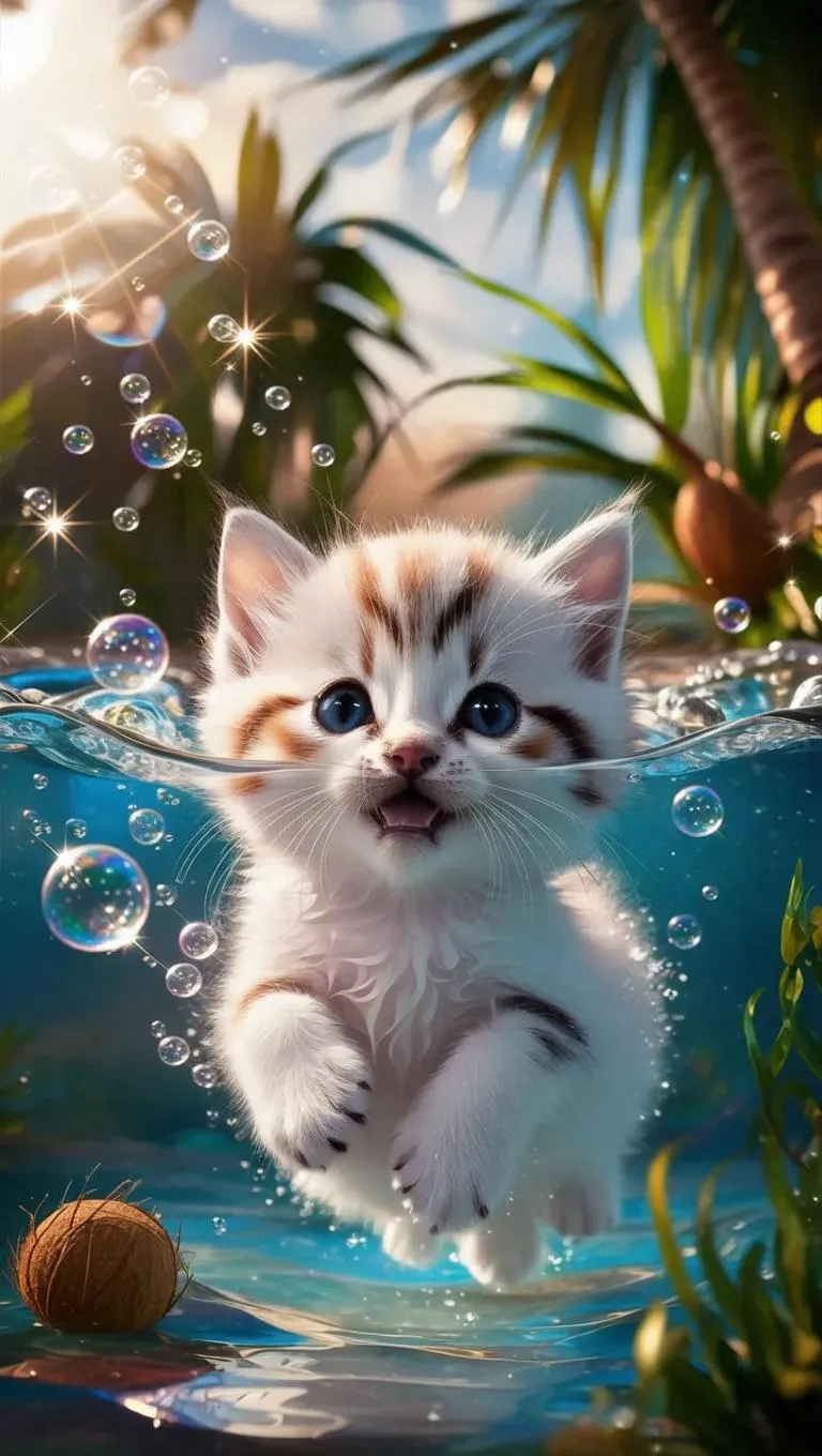Generate hyper-realistic 8K AI images of a white kitten submerged in sparkling water with blue eyes, sunlight reflections, and tropical coconut trees. Professional-grade 3D visuals capture bubbles, aquatic plants, and soft blurred backgrounds for nature-inspired creative projects. Ideal for realistic animal-focused tropical paradise scenes.