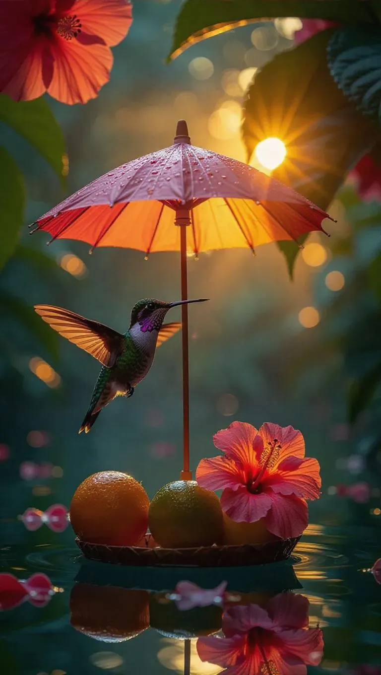 A hummingbird hovers gracefully beneath an elegant dragonfruit umbrella on a delightful floating grapefruit raft, surrounded by calm, azure waters, with blooming hibiscus and a cheerful dawn streaming golden light across the sky.