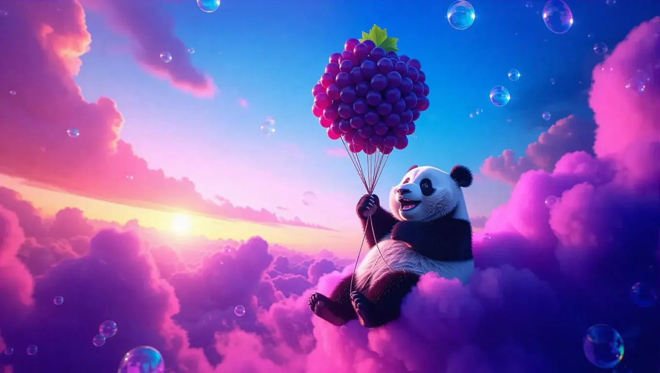 A joyful panda piloting a whimsical balloon crafted from tangled grapes, soaring through vibrant crystalline clouds, with a trail of grape juice glistening in the afternoon sun, creating a magical and surreal atmosphere.