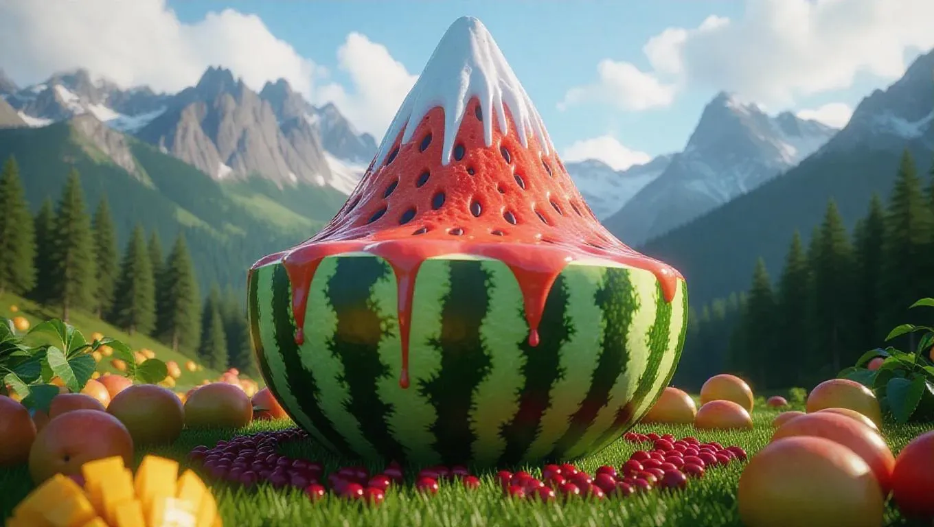 A mountain carved from a giant watermelon, with icy fruit punch cascading down its peak, surrounded by ripe mango and elderberry meadows.