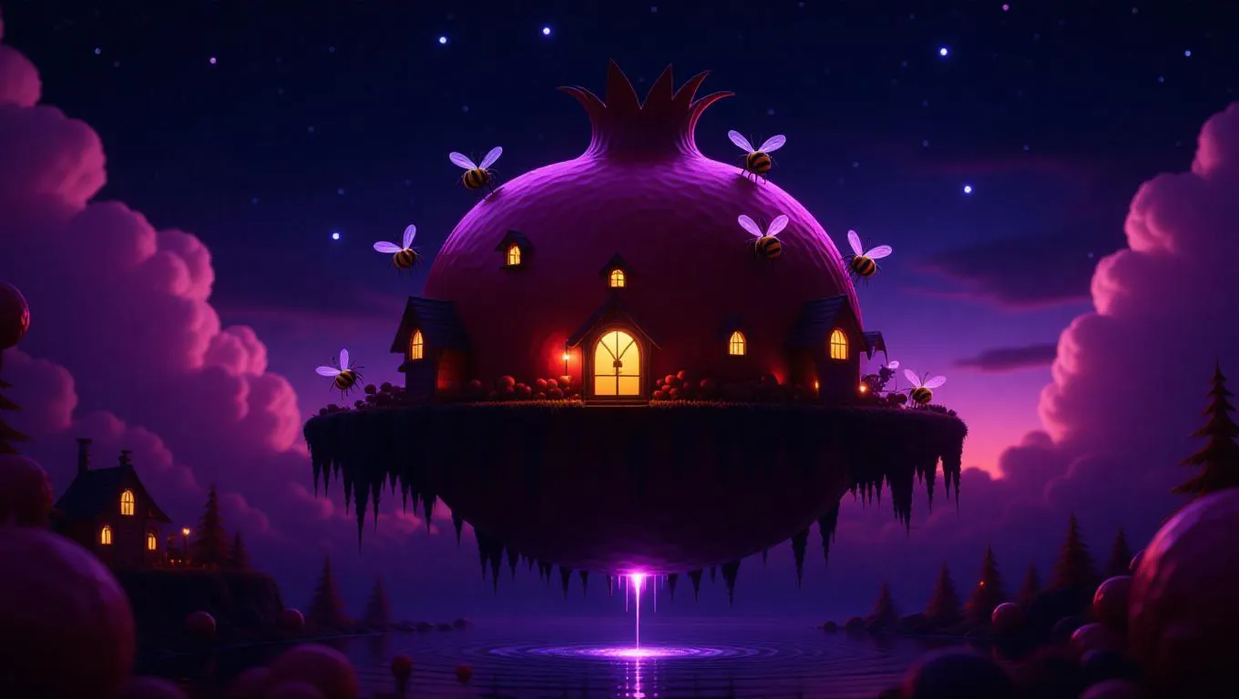 An imaginative floating realm shaped like a giant pomegranate, embellished with tiny bee-shaped homes and rivers flowing with ruby juice, hovering under a deep twilight sky, with twinkling stars and a whispering breeze.
