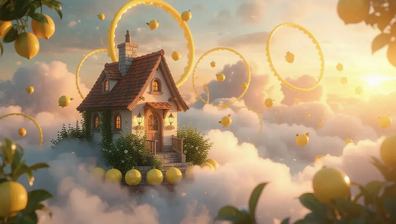 Text to ImageA tranquil cottage nestled in mystical clouds, encircled by floating fruit rings and lemon birds serenading with gentle lullabies, creating a whimsical and serene atmosphereRecreate