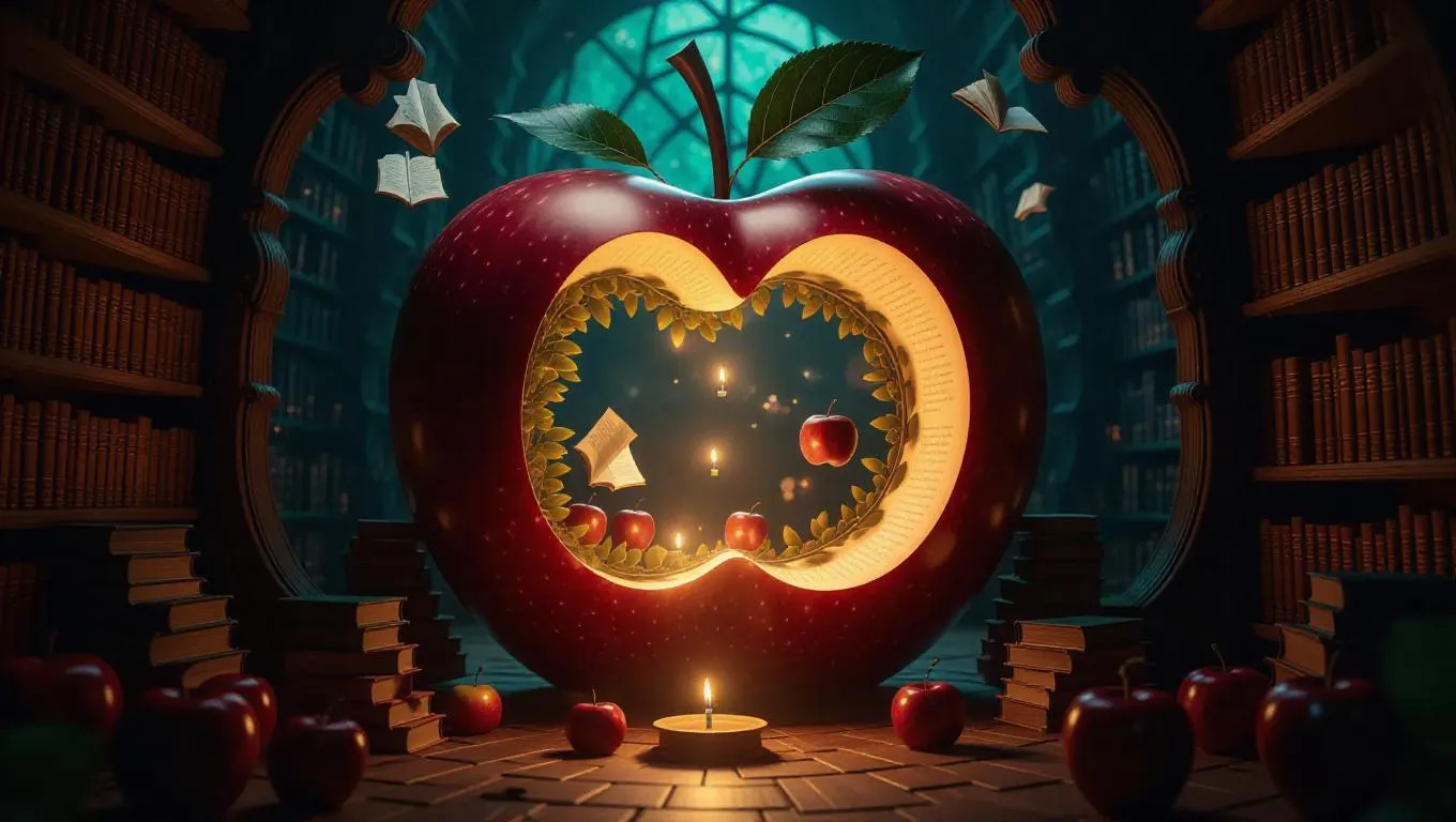 A mystical library nestled within a colossal apple core, illuminated by glowing fruit scrolls that cast a gentle, ethereal glow. Flying bookworms sip sweet nectar from the scrolls, creating a whimsical and enchanting atmosphere. The walls are lined with forgotten lore and intricate carvings, enhancing the magical ambiance.