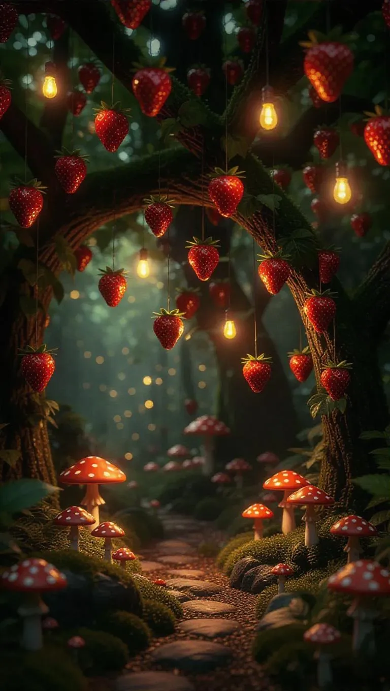 An enchanting world where trees grow upside-down, strawberries hanging like glowing lanterns, casting a soft, warm light. The forest floor is dotted with magical mushrooms, and the air is filled with a rich, earthy aroma. Twinkling fireflies dance around the strawberry-lanterns, adding a magical touch to the scene.