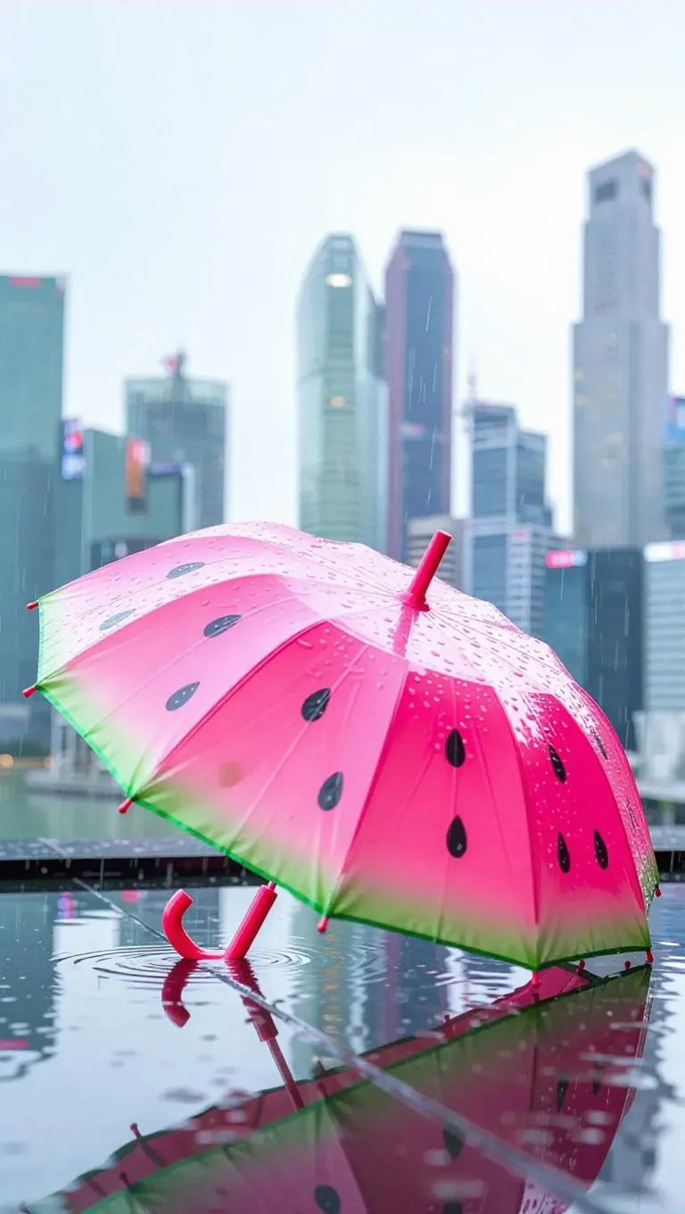 Text to ImageA charming umbrella shaped like a watermelon slice, open under a picturesque light rain, with droplets glinting on its vibrant pink and green surface, set against a modern urban skyline.Recreate
