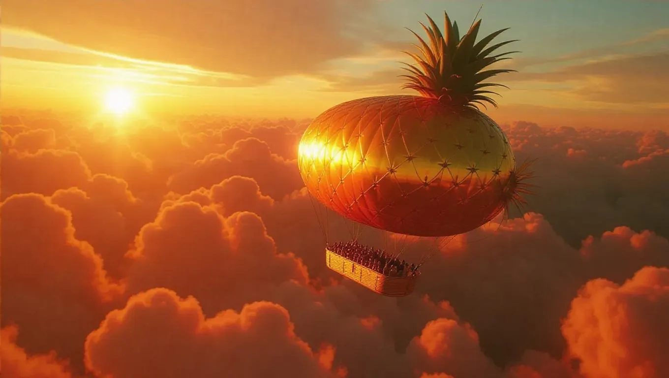 A whimsical pineapple-shaped blimp gracefully gliding through vibrant orange skies, carrying delighted travelers. The blimp's vibrant hue contrasts with the fluffy, marshmallow clouds, creating a surreal and enchanting atmosphere. Sunlight filters through, casting a warm, golden glow that enhances the magical journey.