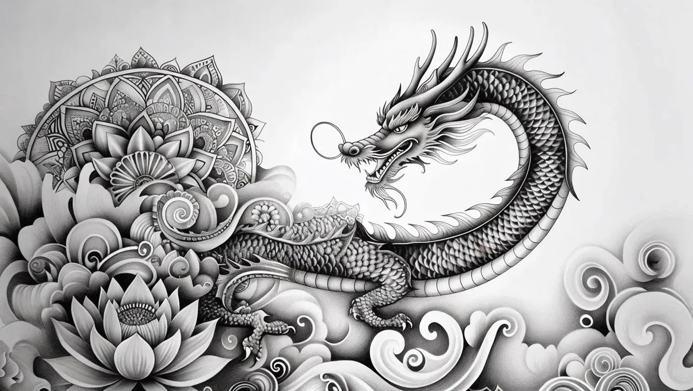 Create intricate black and white dragon mandala art for coloring—detailed patterns, lotus flower foreground, flowing mane, and mandala background. Perfect for relaxation and creativity. Generate stunning AI-designed coloring pages with Vivago.ai's tools.