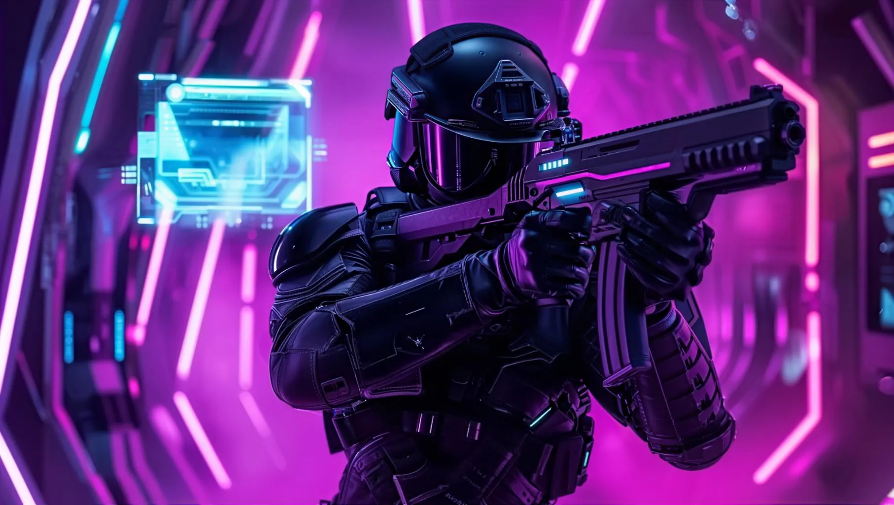 AI-generated soldier in sleek black tactical gear wielding a futuristic energy weapon, set in a high-tech cyberpunk environment with glowing purple LED accents, cybernetic enhancements, and holographic interfaces. Explore cutting-edge military sci-fi visuals powered by advanced AI image generation technology.