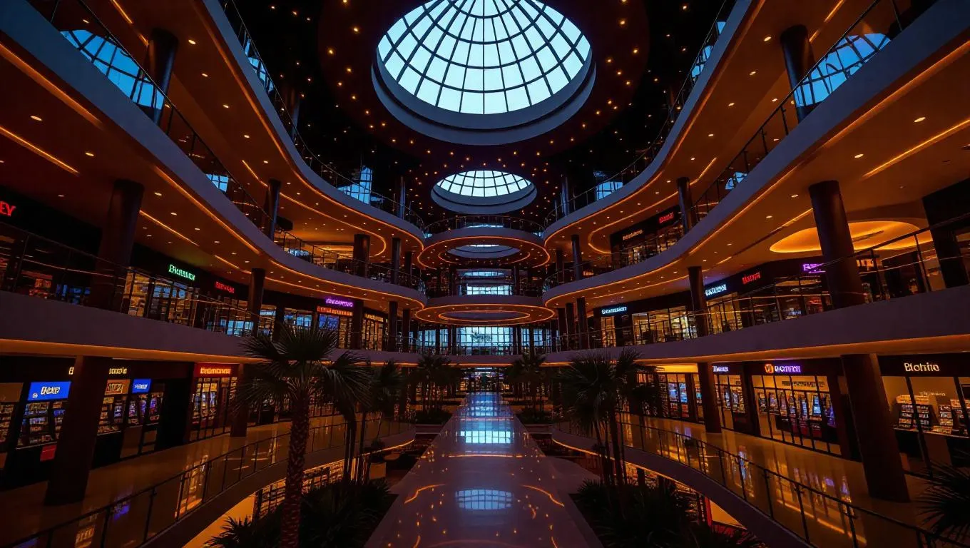 Create stunning AI-generated images of a 50-story amusement park with modern indoor/outdoor design. Features a massive central atrium lined with thrilling rides, interactive exhibits, and arcade games. Bathed in natural light from a grand glass dome, elegant curved balconies offer breathtaking views. Perfect for all ages. Explore limitless AI creativity with VivaGo.ai.